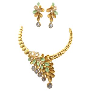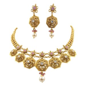 ₹6,95,237 Incl. GSTExude timeless elegance with our antique gold designer necklace set, complete with matching earrings. Featuring intricate craftsmanship and vintage charm, this set is perfect for weddings and special occasions.