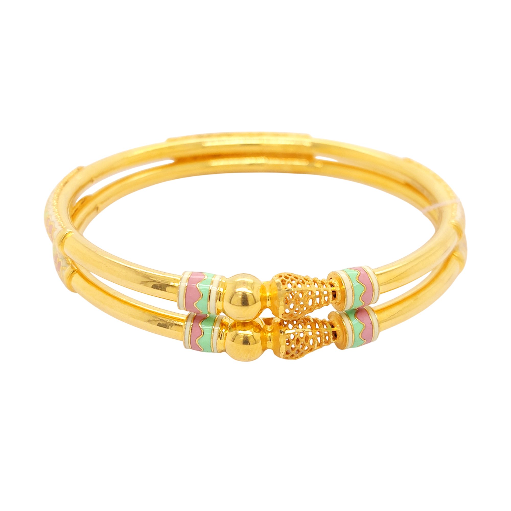 A stunning set of 2 gold bangles, crafted with elegance and precision. Perfect for adding a touch of tradition and sophistication to any attire.