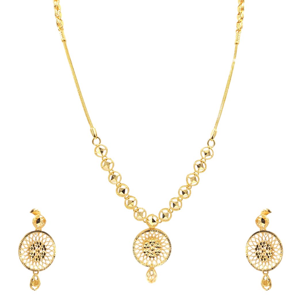 A stunning gold necklace with matching earrings, designed with elegance and finesse. Perfect for adding a touch of sophistication to any special occasion.