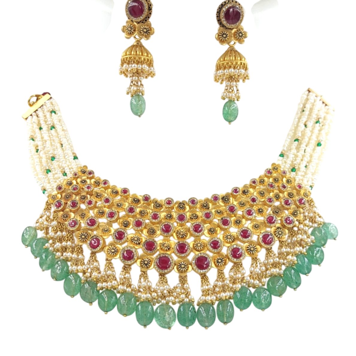 Exude timeless elegance with our antique gold designer necklace set, complete with matching earrings. Featuring intricate craftsmanship and vintage charm, this set is perfect for weddings and special occasions.