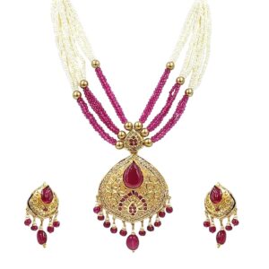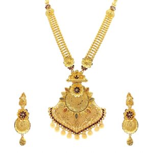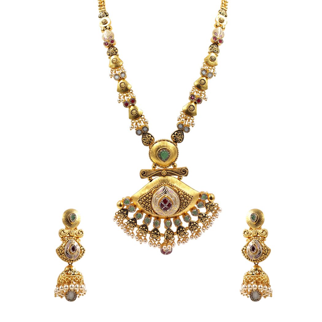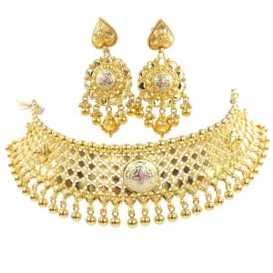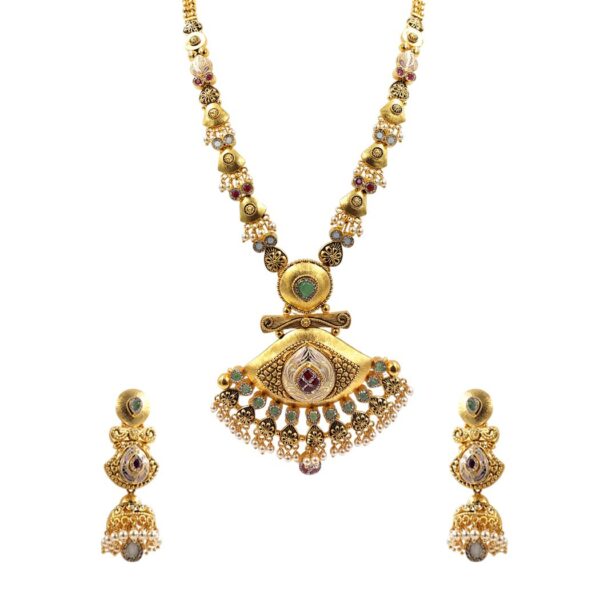 Exude timeless elegance with our antique gold designer necklace set, complete with matching earrings. Featuring intricate craftsmanship and vintage charm, this set is perfect for weddings and special occasions.