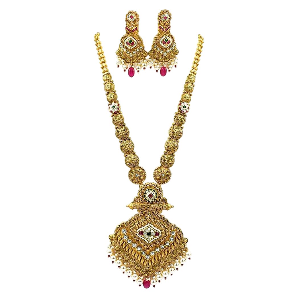 Exude timeless elegance with our antique gold designer necklace set, complete with matching earrings. Featuring intricate craftsmanship and vintage charm, this set is perfect for weddings and special occasions.