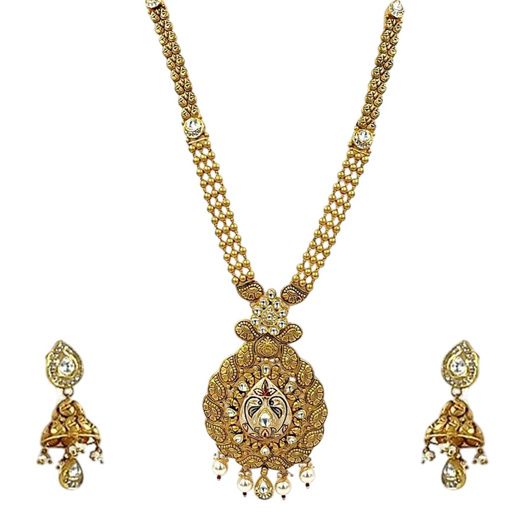 Exude timeless elegance with our antique gold designer necklace set, complete with matching earrings. Featuring intricate craftsmanship and vintage charm, this set is perfect for weddings and special occasions.